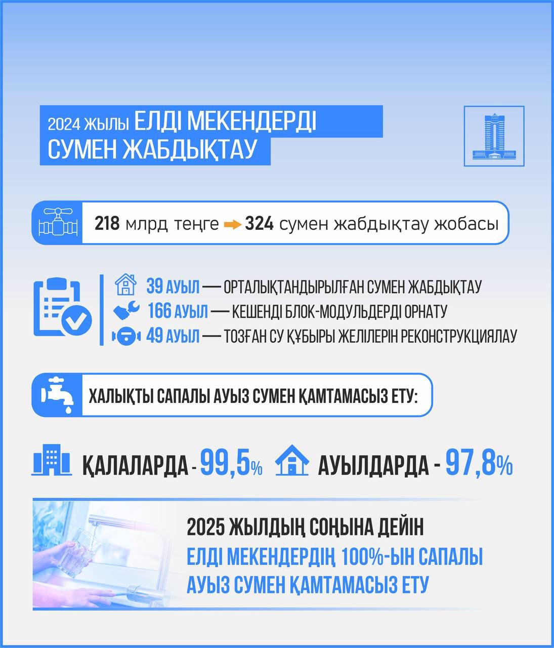 📌 2024 жылы Қазақстан су секторын цифрландыру саласында елеулі қадам жасады. Су ресурстарын тиімдірек басқаруға және ықтимал табиғи апаттарды болжауға көмектесетін заманауи ақпараттық және аналитикалық жүйелер енгізілді.