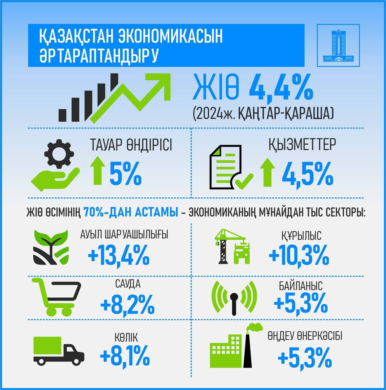 ⚡️ Алдын ала бағалау бойынша осы жылдың 11 айының қорытындысы бойынша ЖІӨ өсімі 4,4%-ды құрады, ол негізінен мұнайдан тыс секторды дамытумен қамтамасыз етілген. Экономика өсімінің 70%-дан астамы өңдеу өнеркәсібі, сауда, ауыл шаруашылығы және құрылыс есебінен қалыптасты. Салалар бөлінісінде келесідей динамика байқалады: ауыл шаруашылығында жалпы өнім шығарудың 13,4%-ға өсуі байқалды, бұл 2011 жылдан бергі ең жоғары көрсеткіш саналады; құрылыста – 10,3%; саудада – 8,2%; көлік қызметтерінде – 8,1%; байланыста – 5,3%; өңдеу өнеркәсібінде – 5,3%. Жалпы, аталған кезеңде отандық тауарлар өндірісі 5%,-ға, көрсетілген қызметтер 4,5%-ға өсті. Негізгі капиталға салынған инвестициялар көлемі 3,1%-ға артып, 15,8 трлн теңгеге жетті.