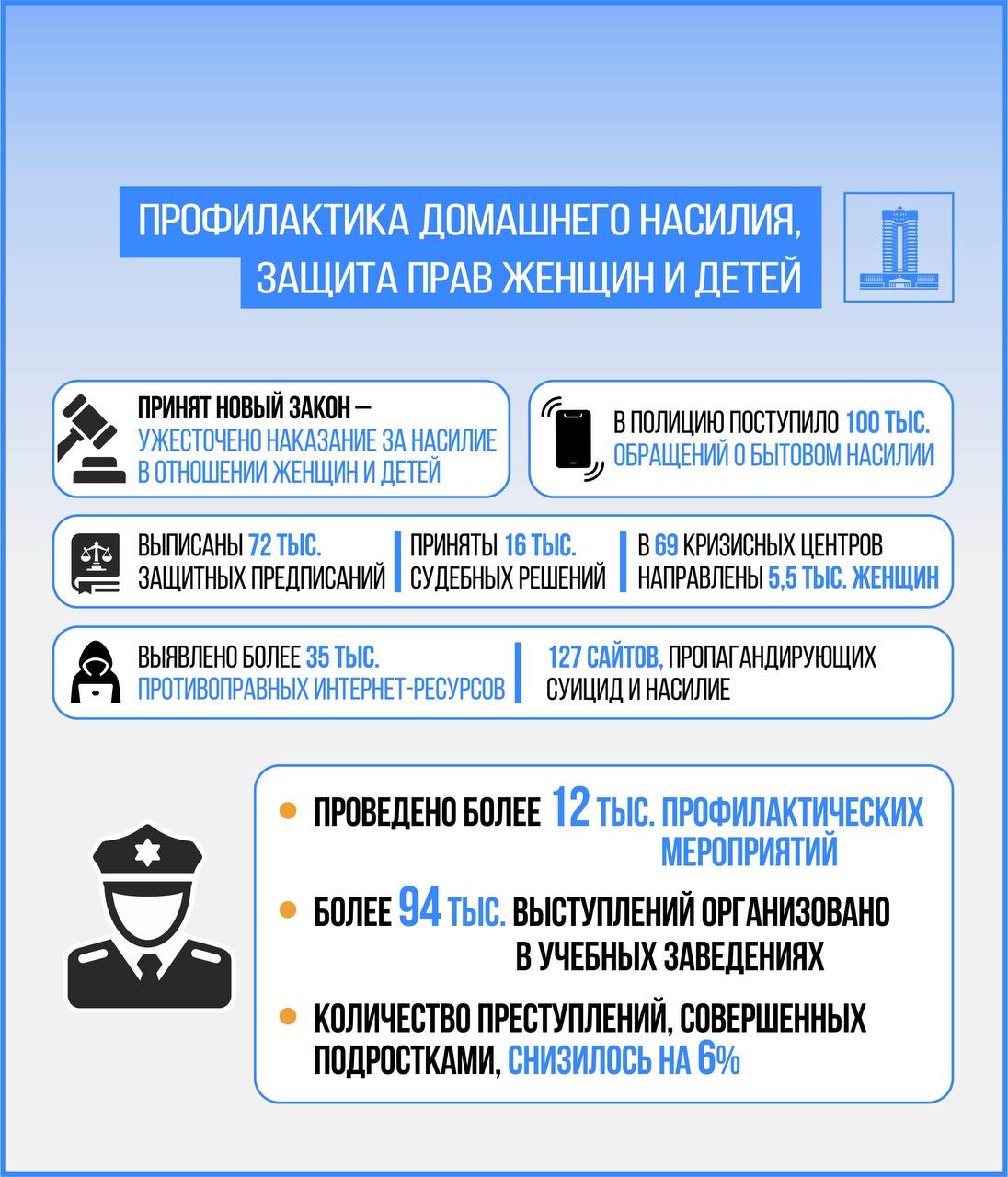 🔷 В стране функционируют 69 кризисных центров, предоставляющих помощь пострадавшим женщинам и детям. С начала года в такие центры обратились 5,5 тыс. женщин, из которых 3,7 тыс. были с детьми.
