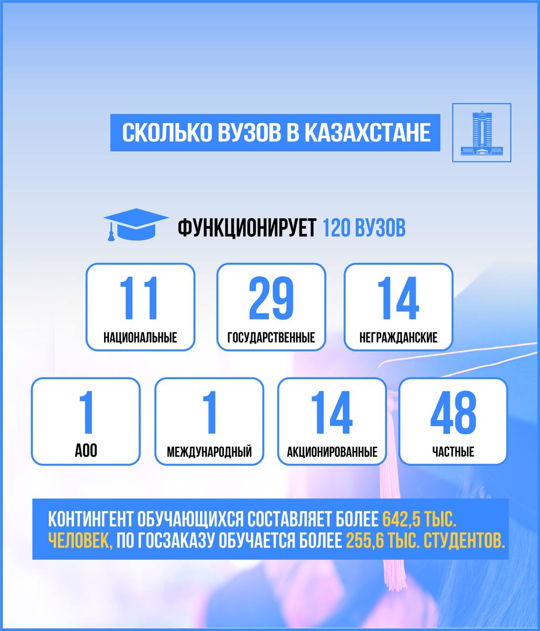 ⚡️ В Казахстане функционирует 120 высших учебных заведений, из них национальные вузы – 11, государственные – 29, негражданские – 14, АОО (Автономная организация образования) – 1, международный – 1, акционированные – 16 и частные – 48.