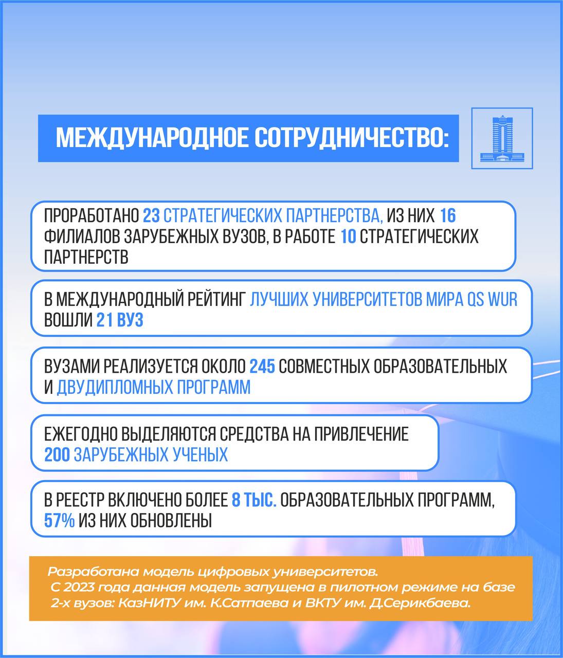 ✔️ Разработана модель цифровых университетов. С 2023 года данная модель запущена в пилотном режиме на базе 2-х вузов: КазНИТУ им. К.Сатпаева и ВКТУ им. Д.Серикбаева.
