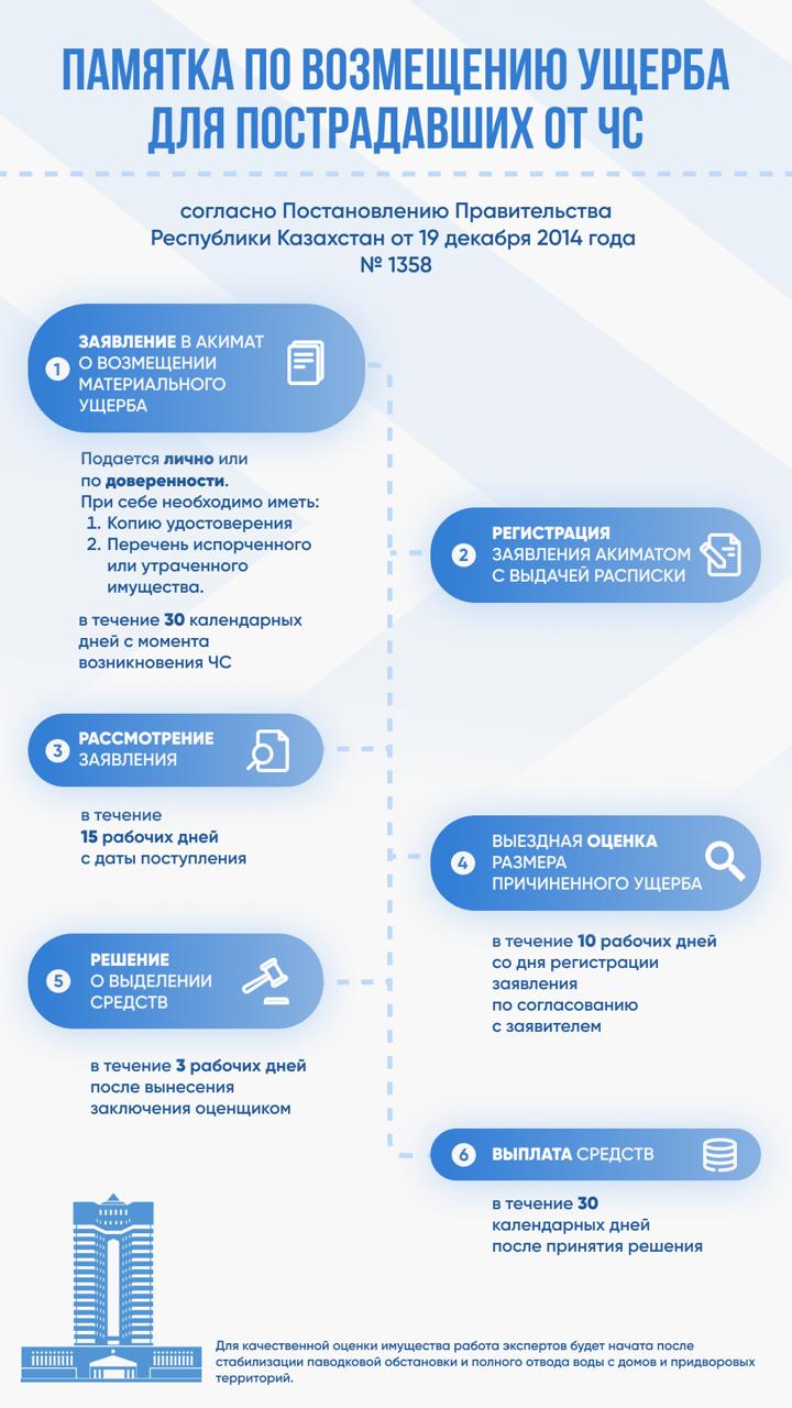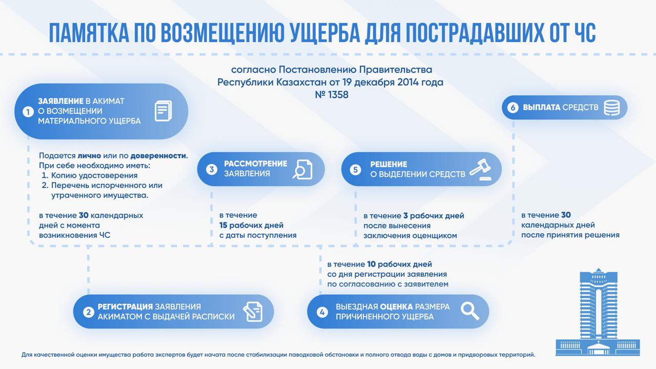 - Пострадавшие, понесшие материальный ущерб, в течение 30 календарных дней со дня возникновения ЧС представляют в местный исполнительный орган (акимат) заявление о возмещении материального ущерба.