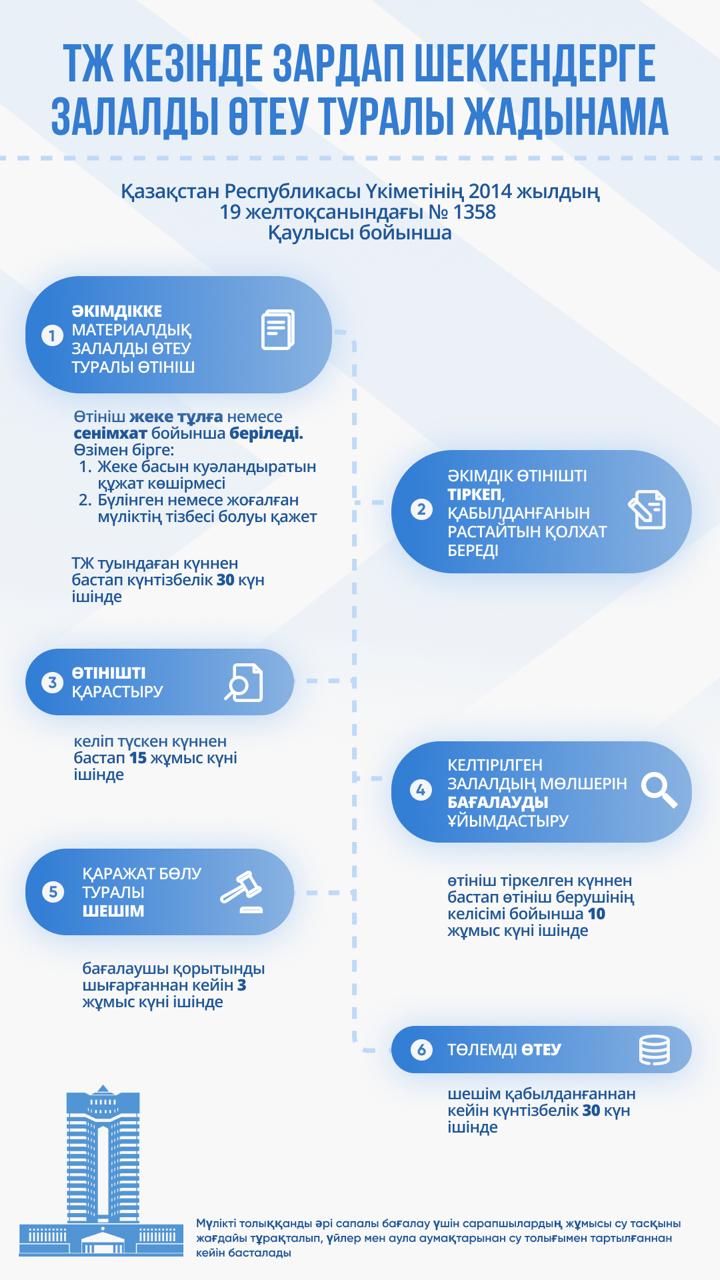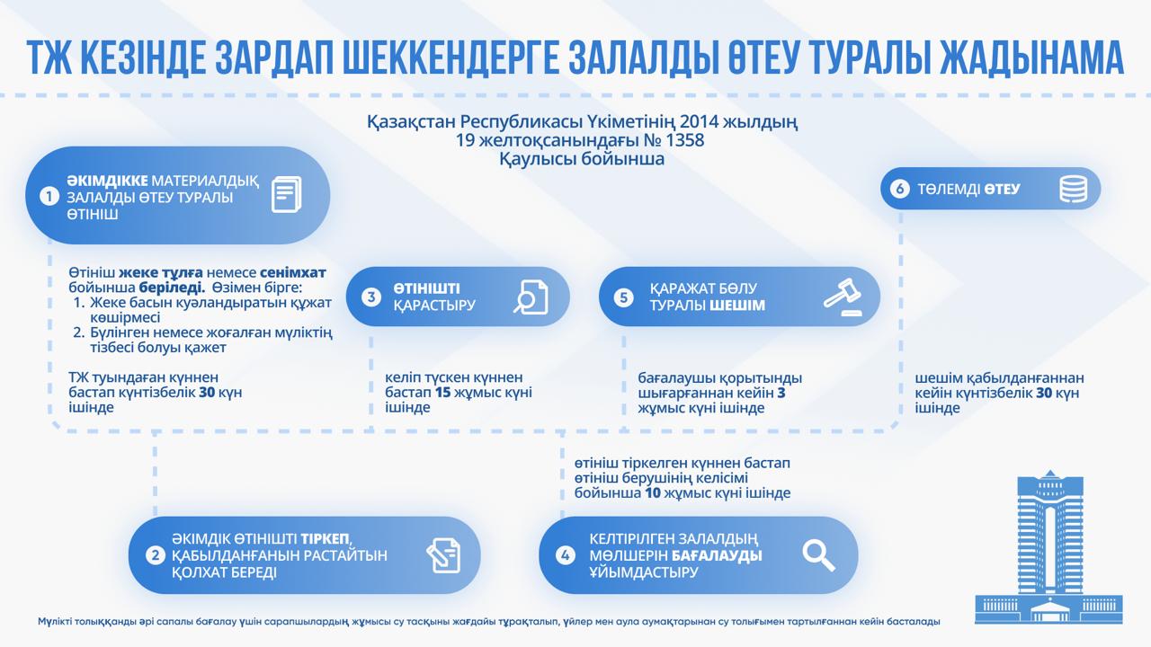 - Материалдық залал келтірілген зардап шегушілер ТЖ туындаған күннен бастап күнтізбелік 30 күн ішінде жергілікті атқарушы органға (әкімдік) материалдық залалды өтеу туралы өтініш береді.