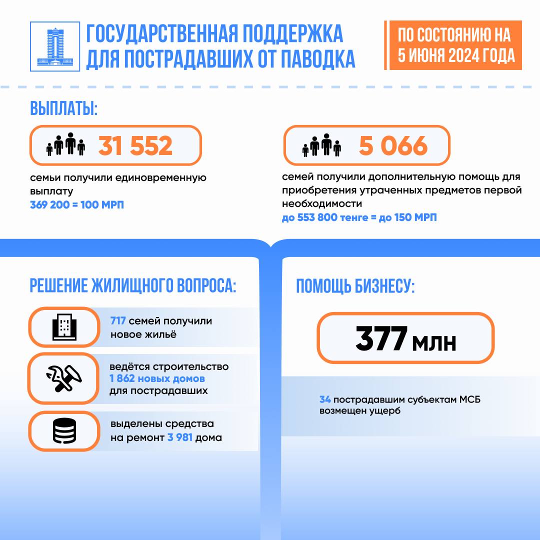 ✔️ 717 семей получили новые дома и квартиры взамен разрушенного жилья. Так, 298 домов/квартир предоставлены жителям Костанайской, 85 — Акмолинской, 121 — Актюбинской, 135 — Северо-Казахстанской, 70 — Западно-Казахстанской, 6 — Карагандинской, 2 — Павлодарской областей. Ведется строительство порядка 1 862 новых домов для пострадавших жителей.