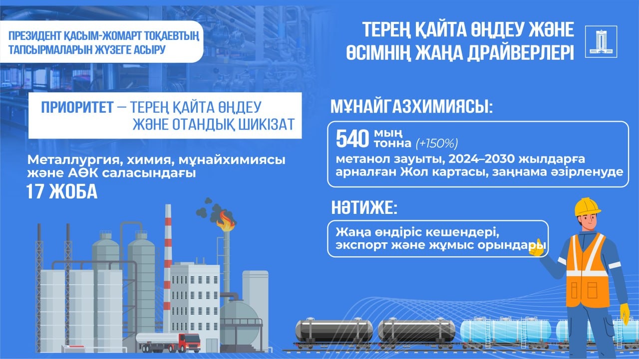 Сектор үшін маңызды қадамдардың бірі – метанол өндіретін зауыт салу жөніндегі алғашқы инвестициялық келісімге қол қойылуы болды. Бұдан бөлек, мұнай-газ химиясы өнеркәсібін дамытудың 2024-2030 жылдарға арналған Жол картасы бекітілді. Сондай-ақ «Мұнай-газ химиясы өнеркәсібі туралы» жаңа заңның жобасы әзірленіп жатыр, оны 2026 жылы қабылдау жоспарланып отыр.