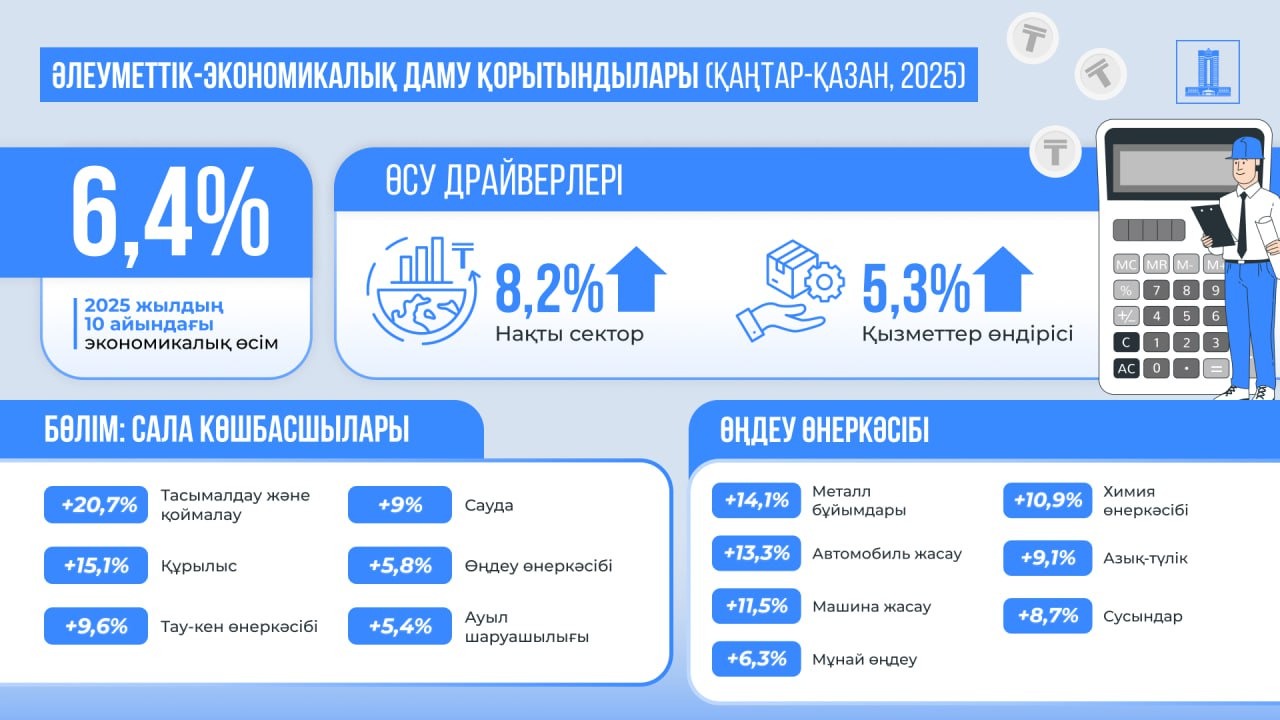 Оның мәліметтері бойынша, нақты сектордағы өсу қарқыны 8,2%-ды құрады, ал қызмет көрсету өндірісі 5,3%-ға өсті. Салалар арасында көлік қызметтері (өсім 20,7%-ға), құрылыс (15,1%-ға) және тау-кен өнеркәсібі (9,6%-ға) ең жоғары өсімді көрсетеді. Сауда – 9%-ға, өңдеу өнеркәсібі – 5,8%-ға, ауыл шаруашылығы – 5,4%-ға өсті.