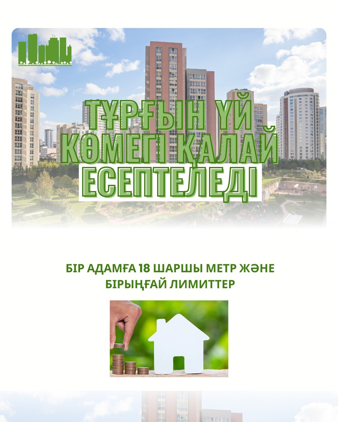 Тұрғын үй көмегі = Отбасының нақты шығындары (коммуналдық төлемдер, тұрғын үй мен аула аумағын күтіп-ұстау, күрделі жөндеу, жалдау ақысы және т.б.) – Рұқсат етілген шығын деңгейі.